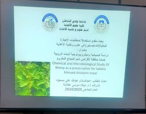 تم صباح اليوم الإربعاء الموافق 5-2-2025 مناقشة رسالة ماجستير بقسم علوم وتقنية الأغذية – كلية علوم الأغذية بعنوان ( دراسة كيميائية وميكروبيولوجية لنبات الروبية كمادة حافظة لإقراص لحم الدجاج المفروم)