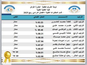 تعلن كلية التقنية الطبية إنه تم إعتماد نتيجة الفصل الدراسي ربيع 2025 اليوم الموافق الثلاثاء 29-7-2025 ، فعلى الطلاب التواصل مع مشرفينهم الأكاديميين للاطلاع على النتائج .