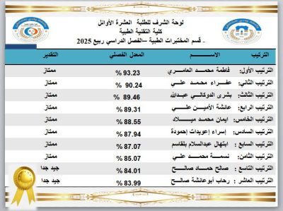 وكالعادة تزدان نتائجنا بلوحة الشرف للعشرة الأوائل، والذين تحصلوا على أعلى معدلات فصلية لهذا الفصل .