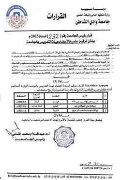 تتقدم إدارة شؤون أعضاء هيئة التدريس بجامعة وادي الشاطئ بأسمى آيات التهنئة والتبريكات للسادة أعضاء هيئة التدريس الذين شملهم قرار السيد رئيس الجامعة رقم (232) لسنة 2025م، بشأن الترقية العلمية، وذلك نظير استيفائهم الشروط الأكاديمية المعتمدة، واجتيازهم الإجراءات المطلوبة بنجاح.