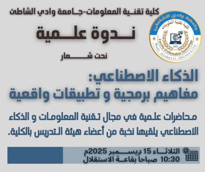 يسر كلية تقنية المعلومات الدعوة لحضور الندوة العلمية المقرر إقامتها غداً الثلاثاء على تمام الساعة 10:30 صباحا بقاعة الاستقلال.