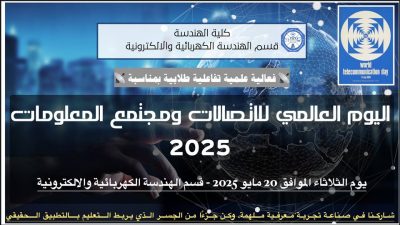 يُعلن قسم الهندسة الكهربائية والإلكترونية وكلية الهندسة بجامعة وادي الشاطئ عن اعتزامهما تنظيم احتفالية بمناسبة اليوم العالمي للاتصالات، وذلك يوم الثلاثاء الموافق 20 مايو 2025، من خلال فعالية علمية تفاعلية طلابية تهدف إلى إبراز أهمية تكنولوجيا الاتصالات وتعزيز التكامل بين التكوين الأكاديمي والممارسة المهنية.