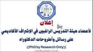 وعليه، تدعو الكلية جميع أعضاء هيئة التدريس في الجامعات الليبية، من الحاصلين على درجة أستاذ مشارك أو أستاذ، والراغبين في الإشراف على رسائل وأطروحات الدكتوراه في هذه التخصصات، إلى التقدّم عبر النظام الإلكتروني المخصّص، وذلك من خلال تعبئة النموذج وإرفاق المستندات المطلوبة.