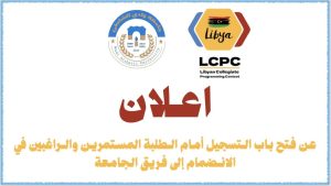 في إطار استعدادها للمشاركة في المسابقة الليبية للبرمجيات 2025، تُعلن جامعة وادي الشاطئ عن فتح باب التسجيل أمام الطلبة المستمرين في الدراسة فقط، والراغبين في الانضمام إلى فريق الجامعة الذي سيمثّلها في هذه الفعالية التقنية على المستوى الوطني.