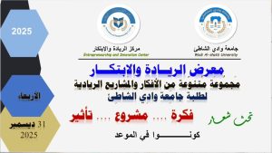إعلان ودعوة عامة لحضور “معرض الريادة والابتكار” بجامعة وادي الشاطئ