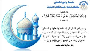 تتقدّم إدارة جامعة وادي الشاطئ بأحرّ التهاني والتبريكات إلى جميع منتسبي الجامعة من أعضاء هيئة التدريس، والموظفين، والمعيدين، والكوادر المساندة، بمناسبة عيد الفطر المبارك، سائلين المولى عز وجل أن يعيده علينا جميعًا بالخير واليُمن والبركات.