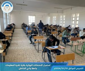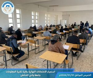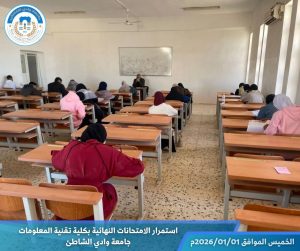 تتواصل الامتحانات النهائية بكلية تقنية المعلومات، وذلك في إطار تنفيذ الخطة الدراسية المعتمدة للفصل الدراسي خريف 2026/2025، حيث استمرت الامتحانات يوم الخميس الموافق 01 يناير 2026م، وفق الجداول المعتمدة من قبل قسم الدراسة و الامتحانات بالكلية.