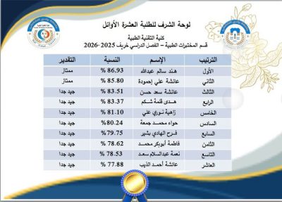 كما يسر إدارة الكلية وكل منتسبيها بالتقدم بأحر التهاني والتبريكات للطلاب العشرة الأوائل الذين تحصلوا على أعلى معدلات فصلية و الذين زينت أسماؤهم لوحة الشرف لهذا الفصل ، متمنيين لهم دوام النجاح والتفوق .