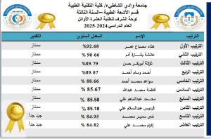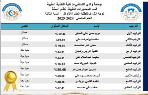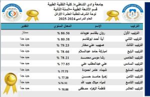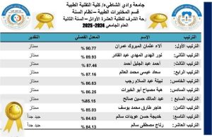 الثلاثاء الموافق 1\7\2025 . تعلن كلية التقنية الطبية لطلابها الاعزاء في النظام السنوي أن نتيجة العام الجامعي 2024\2025 – الدور الأول ، قد تم اعتمادها اليوم و يمكنهم التوجه لأقسامهم للحصول على نتائجهم . وكالعادة لا يفوت كلية التقنية الطبية التي دأبت على تشجيع أبناءها الطلاب والاحتفاء بهم وتقدير جهودهم و حثهم على مزيد من الجد والاجتهاد ، أن نعلن قوائم العشرة الأوائل في أقسام الكلية وهم :