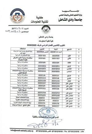 Eman Almahdi سبتمبر 7, 2025 الأخبار, كلية تقنية المعلومات التقويم الاكاديمي للفصل الدراسي خريف 2026/2025م. عدد المشاهدات: 3