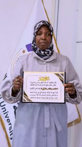 وفي ختام الفعالية، تقدم طلبة قسم الكيمياء بـشهادة شكر وتقدير إلى الأستاذة عائشة عبدالقادر محمد، رئيس قسم الكيمياء، تقديرًا لدعمها المتواصل وحرصها الدائم على تشجيع الطلبة ودعم الأنشطة العلمية والمجتمعية