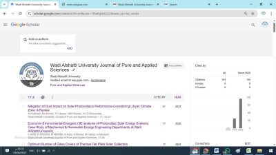 تحديث لمعدلات اقتباس مجلة جامعة وادي الشاطئ للعلوم البحتية والتطبيقية لليوم الخميس الموافق 19 يونيو 2025 . الحمد لله بلغت عدد الاستشهادات بالمجلة 154. وتعدت الاستشهادات في النصف الاول من العام 2025 مجوع الاستشهادت للعامين السابقين وبلغت 114 استشهادا.