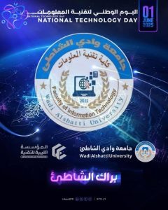 تعلن كلية تقنية المعلومات بجامعة وادي الشاطئ عن الاستعداد لعقد احتفالية علمية بمناسبة اليوم الوطني لتقنية المعلومات، بالشراكة مع المؤسسة الليبية للتقنية ، وذلك يوم الأحد القادم ان شاء الله الموافق 1 يونيو 2025، تحت شعار: