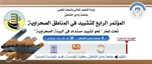 دعوة لجميع المهندسين المدنيين والمعماريين واعضاء هيئة التدريس باقسام الهندسة المدنية والمعمارية بالجامعات الليبية والشركات العاملة فى مجال التشييد والبناء للمشاركة في فعاليات المؤتمر الرابع للتشييد في المناطق الصحراوية الذى يهتم بمشاكل التشييد في المناطق الصحراوية من طرق ومباني … وغيرها والذى تنظمه جامعة وادي الشاطئ يومي الثلاتاء والأربعاء القادم الموافق 28 – 29 / 10 /2025 بمقر جامعة وادي الشاطئ بمدينة براك .. ستلقى خلال جلسات المؤتمر بحوث علمية محكمة فى محاور المؤتمر الاربع وهى :