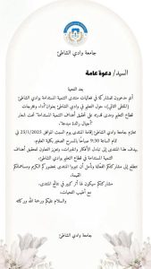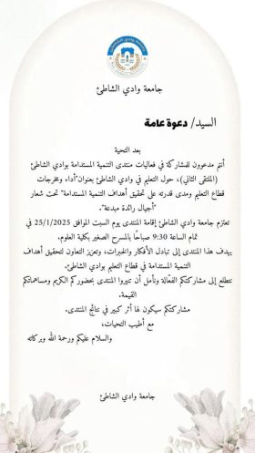 تتشرف جامعة وادي الشاطئ بدعوتكم لحضور فعاليات منتدى التنمية المستدامة بوادي الشاطئ (الملتقى الثاني)، والذي يُقام تحت عنوان: