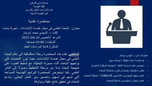 يسر قسم الهندسة المدنية بكلية الهندسة- جامعة وادي الشاطئ دعوة البحاث و الاكادمين من طلبة الدراسات العليا و اعضاء هيئة التدريس المهتمين لحضور المحاضرة العلمية التي يلقيها الدكتور / المهدي محمد ابوحام بعنوان ” البحث العلمي في مجال هندسة الانشاءات – تجربة باحث” وذلك يوم الخميس المقبل الموافق 10-04-2025 علي تمام الساعة العاشرة صباحا ولمدة ساعة واحدة.