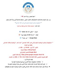 يسر كلية الهندسة بجامعة وادي الشاطئ دعوتكم لحضور ورشة العمل العلمية المتميزة التي ينظمها مركز البحوث والاستشارات العلمية ومكتب التعاون الدولي، بعنوان: