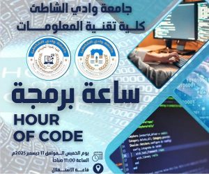 ولأننا في كلية تقنية المعلومات بجامعة وادي الشاطئ مهتمون بالاحداث العالمية التي من شأنها تحفيز طلابنا المستمر وتأهيلهم وتنمية قدراتهم. فقد قرر مجلس الكلية في أجتماعه الدوري العادي لسنة 2025م و المنعقد يوم الثلاثاء بتاريخ 2025/12/02م إحياء الحدث لعام 2025م بداخل أسوار الكلية، حيث يستهدف الحدث جميع طلاب الكليات بالجامعة و المهتمين بمختلف الفئات العمرية و التخصصية بالجامعة و المنطقة عموماً و ذلك بتاريخ 2025/12/11م الموافق ليوم الخميس على تمام الساعة 11:00 صباحاً.