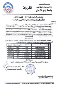 قرار ترقية علمية لأعضاء هيئة التدريس بجامعة وادي الشاطئ