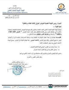وهذا فقد أصدرت الهيئة الليبية للبحث العلمي قرارها الرسمي باعتماد المؤتمر الدولي الثالث للغذاء والتغذية ، مشيدة بالمجهودات التي تبذلها الجامعة والكلية ولجان المؤتمر لتنظيم هذا الحدث العلمي المميز.
