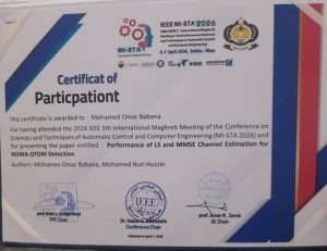 في إطار تعزيز الحضور الأكاديمي والبحثي، شارك الأستاذ محمد عمر بابانه، عضو هيئة التديس بقسم الهندسة الكهربائية والإلكترونية، في أعمال المؤتمر المغاربي الدولي الخامس لعلوم وتقنيات التحكم وهندسة الحاسوب (IEEE MI-STA 2026)، الذي عُقد بمدينة سبها خلال الفترة من 5 إلى 7 أبريل 2026.