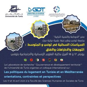 أقيمت يومي 17 و18 أبريل 2025 فعاليات الندوة العلمية الدولية حول “السياسات السكنية في تونس والمتوسط: التوجهات، الإكراهات، والآفاق”، التي احتضنتها كلية العلوم الإنسانية والاجتماعية بجامعة تونس.