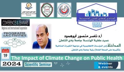 عُقدت صباح اليوم بالمركز الليبي للبحوث الطبية، فعاليات الندوة العلمية “التغيرات المناخية وأثرها على الصحة العامة” بتنظيم مشترك بين المركز الليبي للبحوث الطبية وجامعة الزاوية ومنتدى البحث العلمي من أجل التنمية المستدامة التابع للهيئة الليبية للبحث العلمي، ضمن إطار عمل المنتدى الوطني للمدن المستدامة.