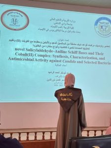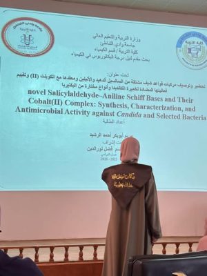 كما تناول البحث الثاني تحضير وتوصيف مركبات قواعد شيف مشتقة من السالسيل ألدهيد والأنيلين ومعقّدها مع الكوبلت (II)، وتقييم فعاليتها المضادة لخميرة الكانديدا وأنواع مختارة من البكتيريا، من إعداد الطالبة مريم أبوبكر أحمد الرشيد، تحت إشراف أ. مريم قاسم نورالدين.