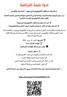 يسر مركز البحوث والاستشارات بجامعة وادي الشاطئ دعوتكم لحضور الندوة العلمية الأولى حول التكنولوجيا والبحث العلمي!
