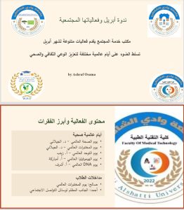 بإشراف وتنسيق وتنظيم الأستاذ أشرف أسامة منسق خدمة وتنمية المجتمع والبيئة في قسم المختبرات الطبية وبحضور عدد من أعضاء هيئة التدريس والطلاب في الكلية، أقيمت اليوم ندوة علمية ثقافية متنوعة ضمت عدد من الأحداث العلمية الطبية المميزة تمتلث في إحياء اليوم العالمي للصحة، اليوم العالمي للمختبرات الطبية، اليوم العالمي لمرض التوحد، اليوم العالمي للحمض النووي، اليوم العالمي لمرض الهيموفيليا، حيث شارك في إعداد وتقديم محاورها كلا من :
