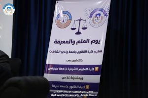 في إطار تعزيز الحراك العلمي وترسيخ ثقافة التكامل بين المعرفة الأكاديمية والممارسة المؤسسية، نظّمت كلية القانون بجامعة وادي الشاطئ، بالتعاون مع كلية العلوم الشرعية/ تاجوراء، وبمشاركة كلية الشريعة والقانون بجامعة فزان وكلية الدراسات الإسلامية بالجامعة الأسمرية (فرع سبها) فعالية “يوم العلم والمعرفة”، في تظاهرة علمية عكست مستوى متقدماً من النضج في الطرح واتساعاً ملحوظاً في دائرة الشراكة الوطنية.